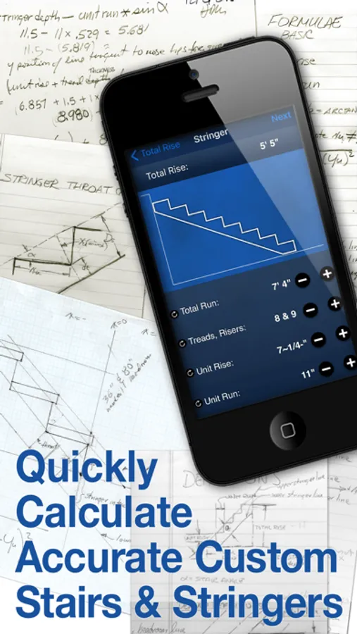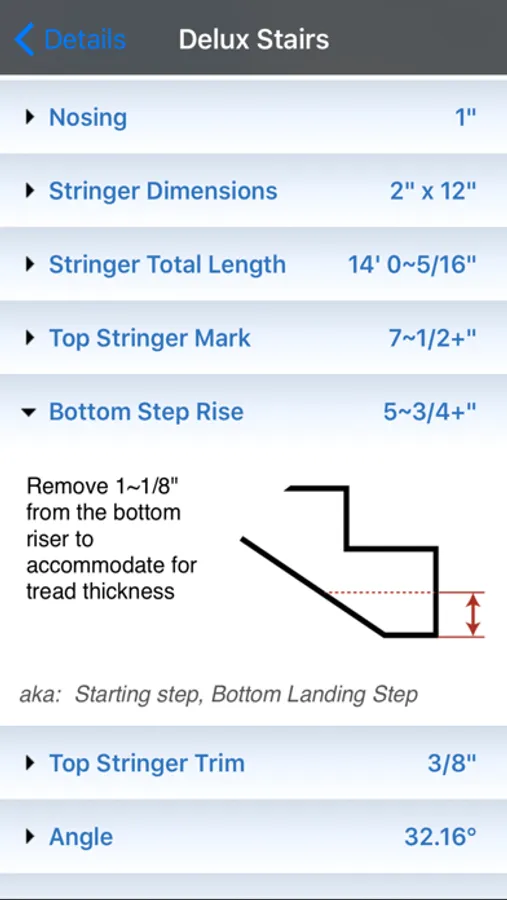 Enter the total rise, and the app calculates total run (base length or overall run), pitch (angle or slope), unit run (goings or tread), unit rise (rise or step height), and all other measurements. You can then adjust the total run to fit your available space or preferred tread materials. A feature unique to Delux Stairs fine-tunes the stringer to accommodate for differences in flooring thicknesses such as the tread thickness and upper and lower finished flooring. This ensures every step is identical, which is the difference between clumsy, dangerous, amateur stairs and professional-quality, comfortable, code-compliant stairs. Additional stair details, such as nosing, riser thickness and stringer dimensions are also calculated and adjustable.