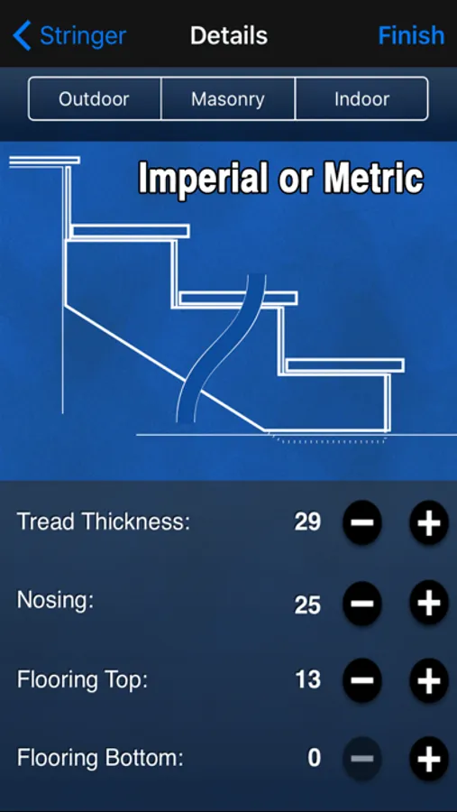 ◎ Presets for Outdoor (decking), Indoor (plywood or hardwood) or Masonry (concrete) stairs.