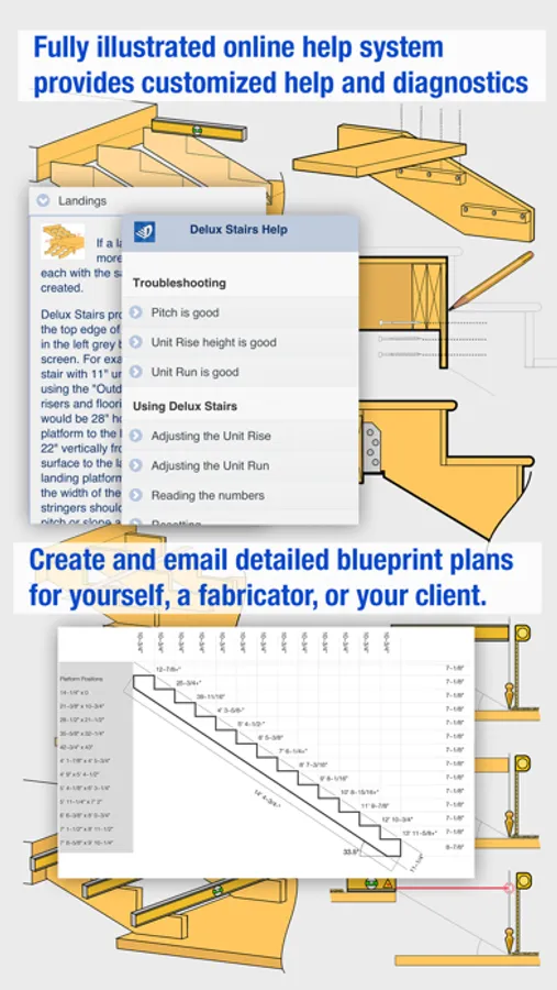 Blueprint plans can be directly printed or emailed in PDF which include platform position options, stringer peak positions, bottom step rise adjustments, top step run adjustments, and more.