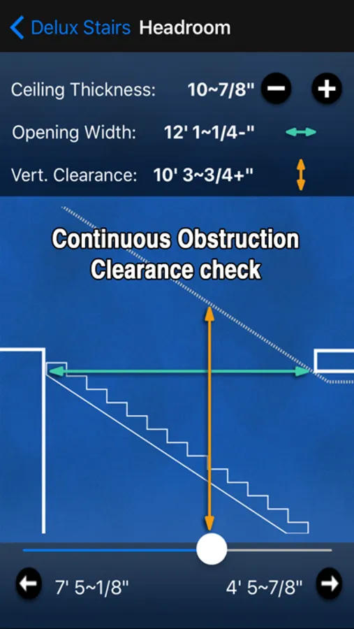 The headroom clearance tool is also unique to Delux Stairs and not only shows you top floor opening requirements with adjustable floor thicknesses, but also continuous headroom obstruction clearance from the top to the bottom of the stairs.
