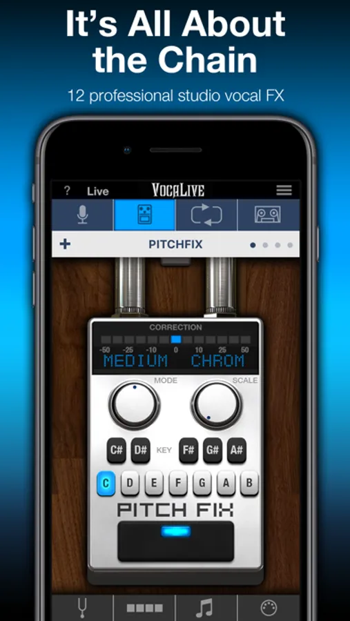 VocaLive CS for iPhone comes with the Reverb effect, and upon registration the Double effect is unlocked. You can add 10 additional effects à la carte from a selection that includes Pitch Fix (for tuning or stylized FX), Choir, Morph, De-Esser, Delay, Parametric EQ, Compressor, Chorus, Phazer and Envelope Filter. Together these effects provide unparalleled creative processing power.