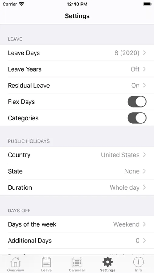 - choose whether you want to track your leave in days or hours