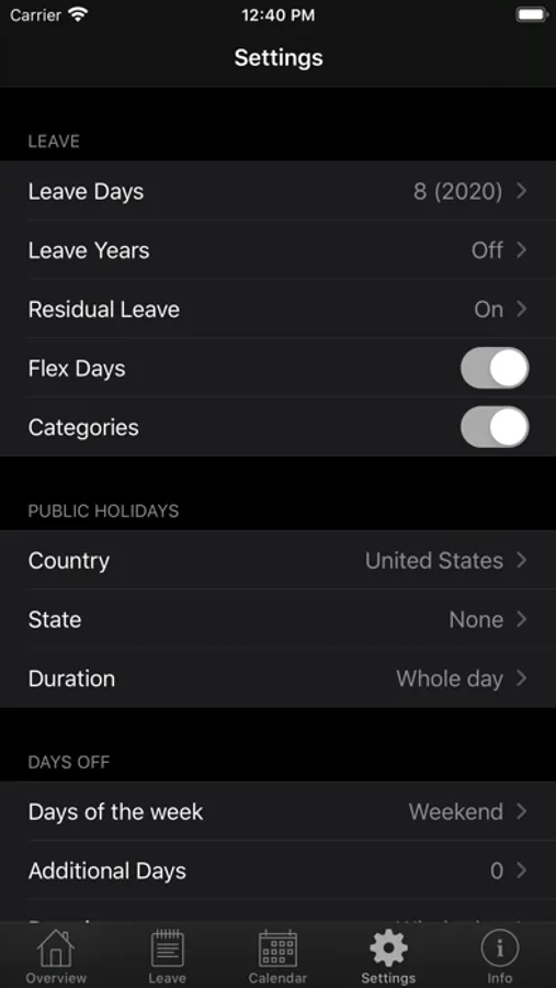 - specify the weekdays the app should count as days off