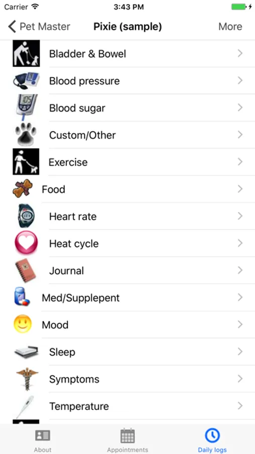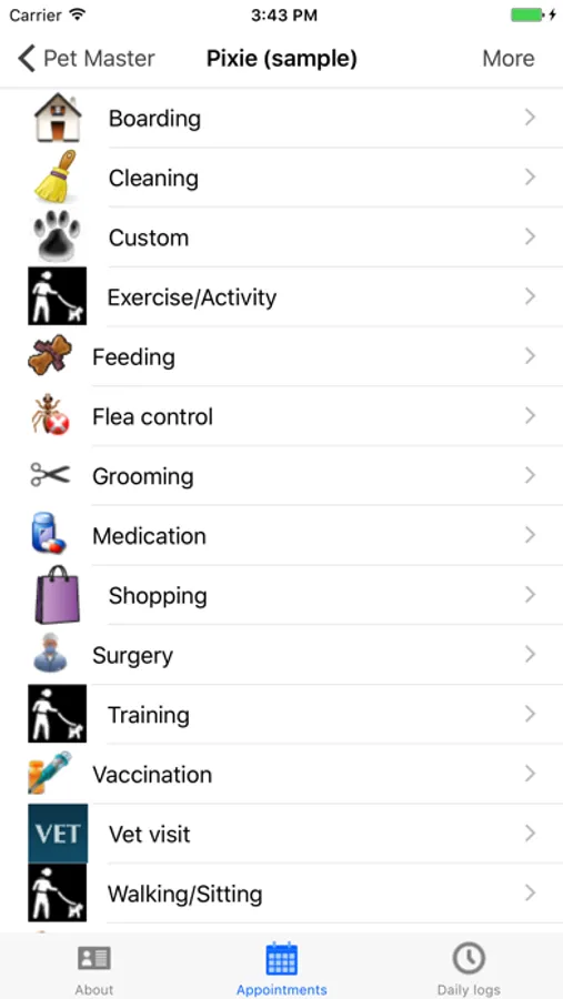 Add medical (Vet visits, vaccinations, surgeries, flea control etc.) and regular appointments (grooming, training, sitter, walker etc.). Also supports repeating appointments. Reminders can be scheduled up.