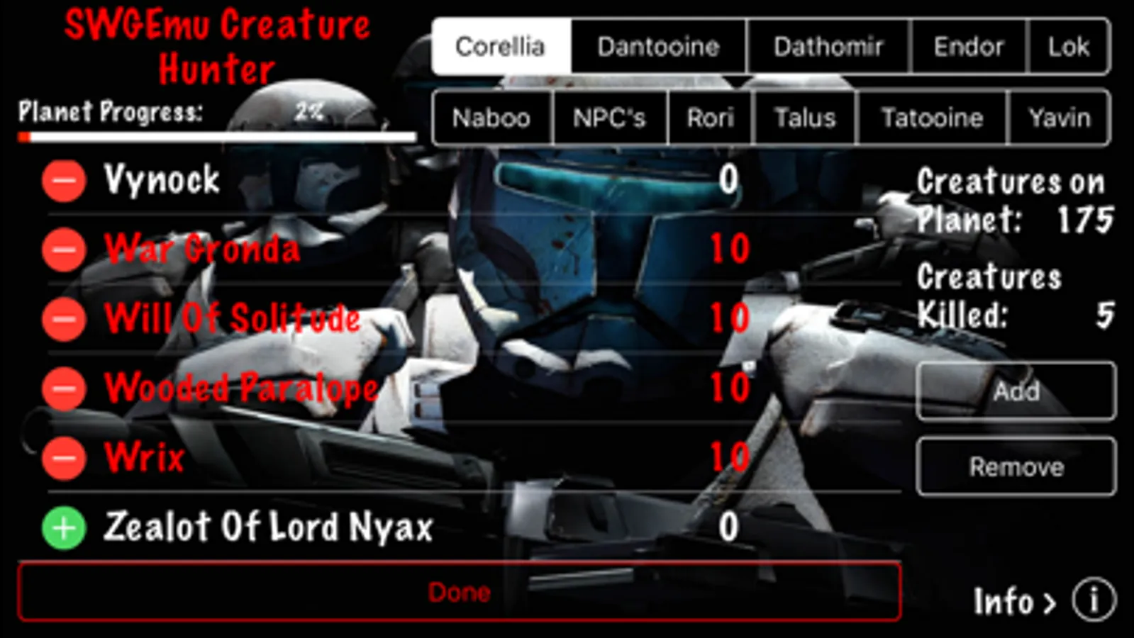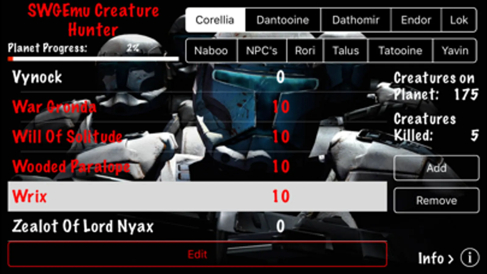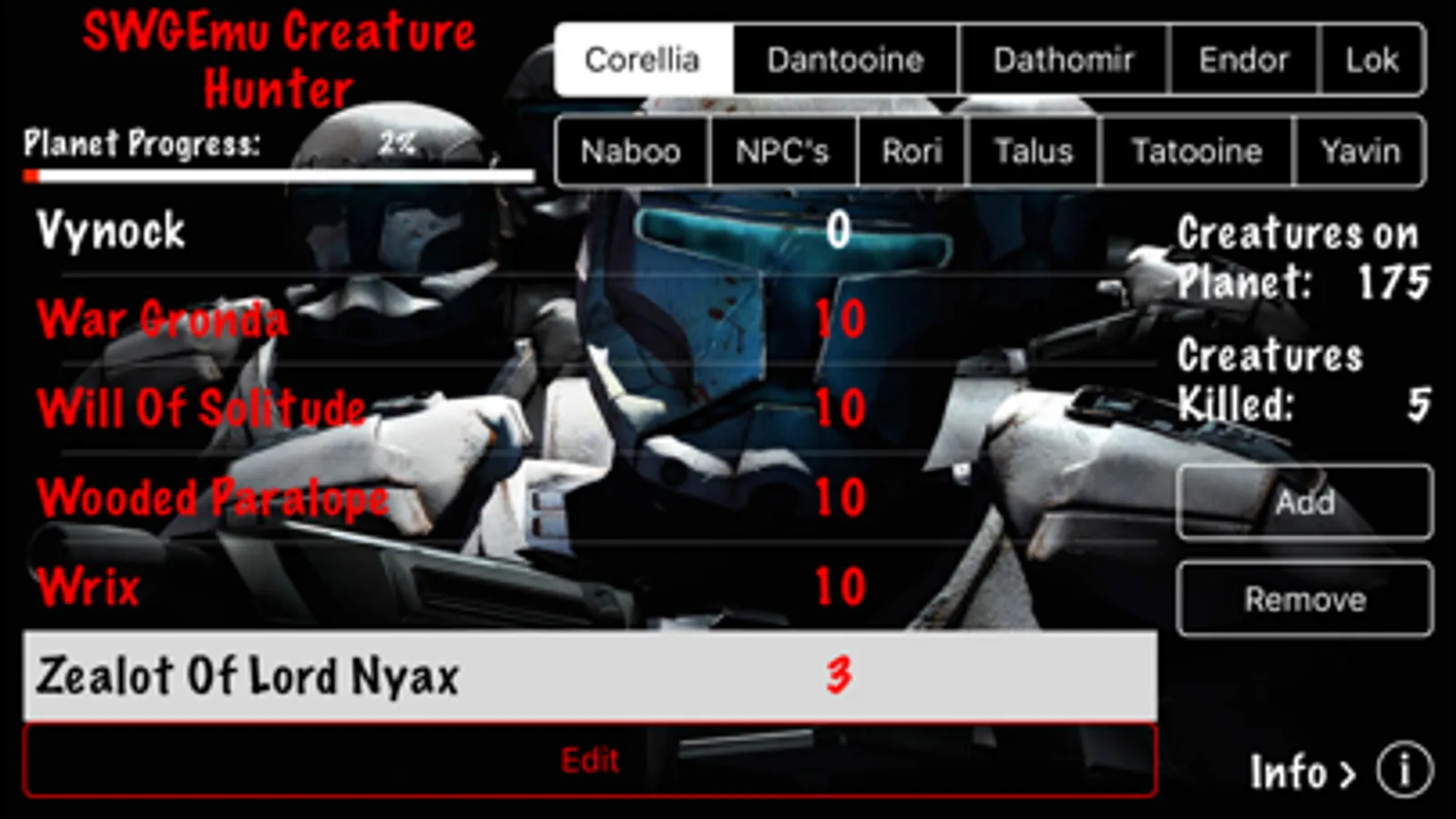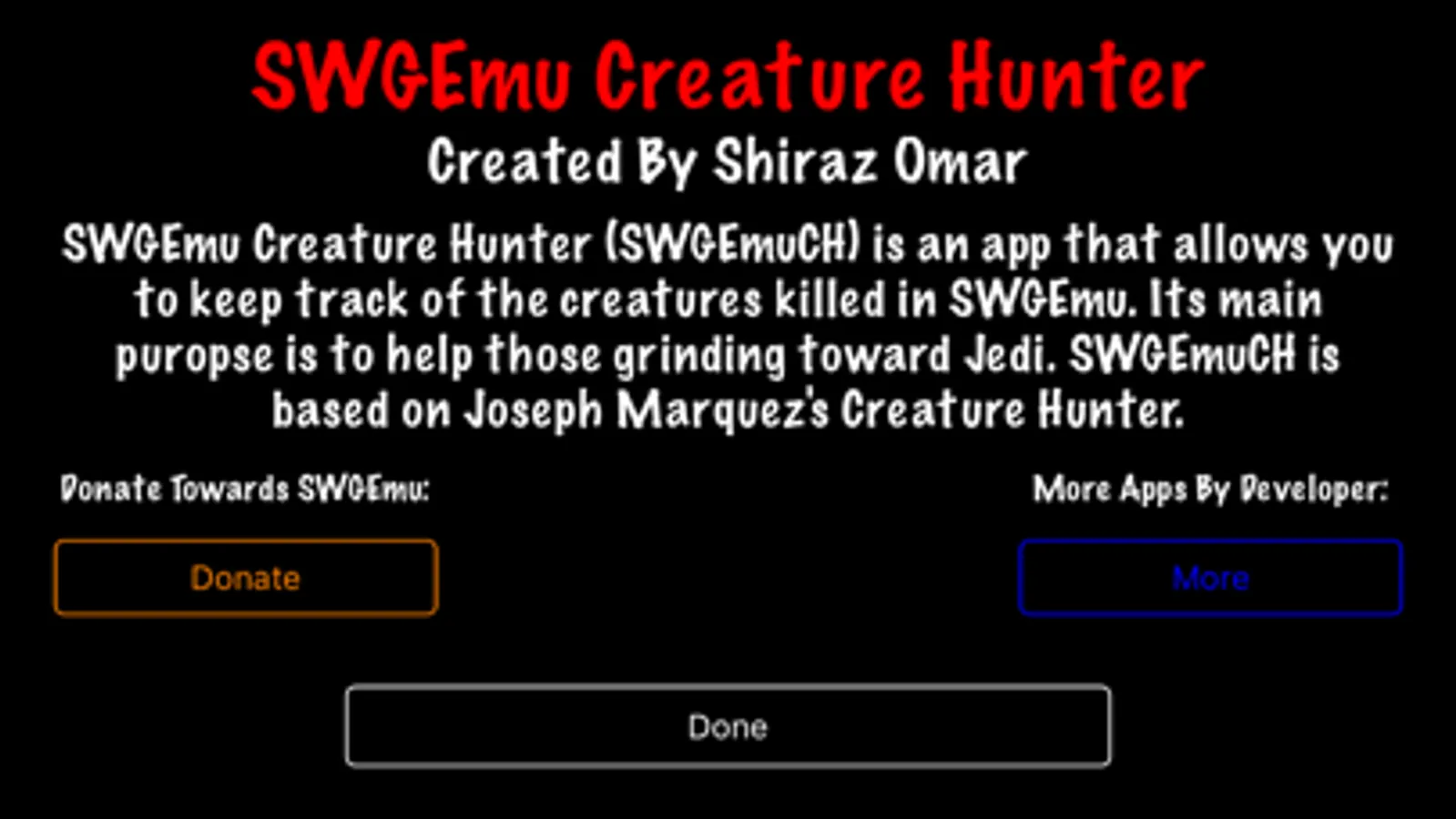 SWGEmu Creature Hunter (SWGEmuCH) is an app that allows you to keep track of the creatures killed in SWGEmu. Its main puropse is to help those grinding toward Jedi. SWGEmuCH is based on Joseph Marquez's Creature Hunter.