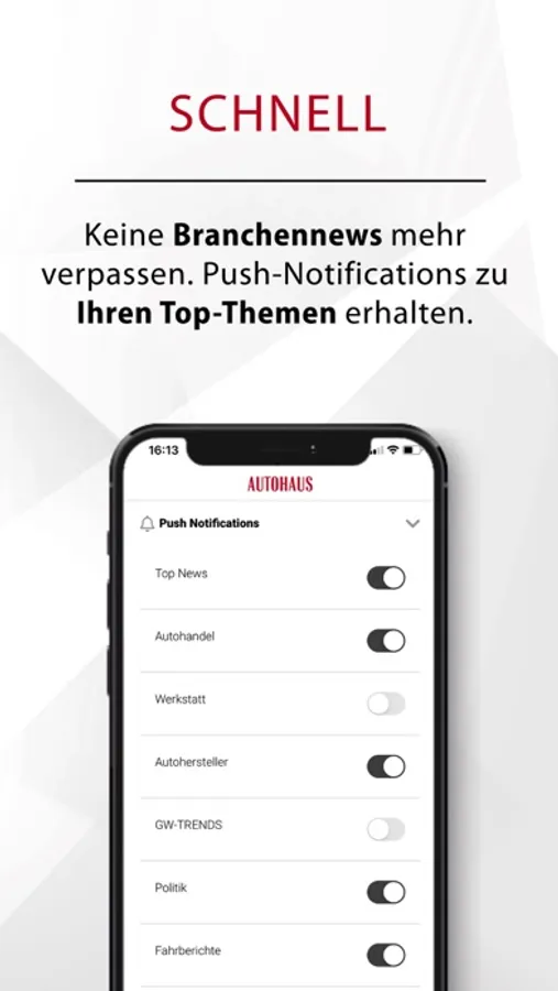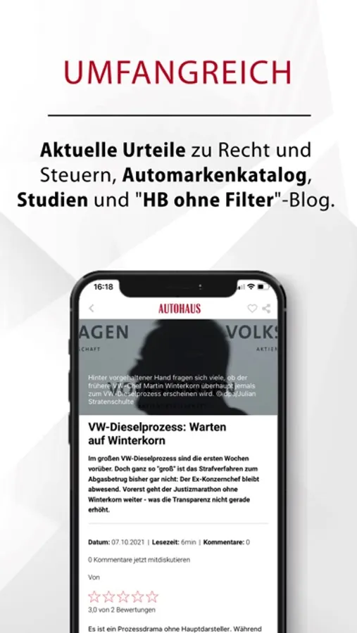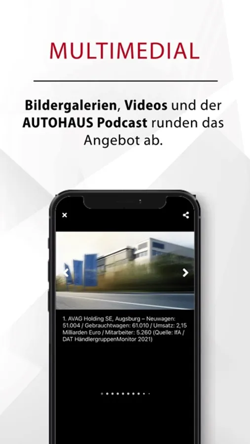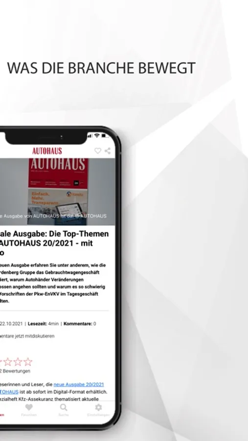 Themenwelten statt nur News: In der AUTOHAUS App haben Sie den Rundumblick auf die Branche dank Features wie den #Hashtags, Artikelempfehlungen, Umfragen, spannenden Bildergalerien u.v.m.. Abgerundet wird das Angebot von einem umfangreichen Branchenverzeichnis, aktuellen Urteilen zu Recht und Steuern, einer Übersicht der Automarken mit Rückruf-Datenbank, exklusiven Marktdaten mit dem AUTOHAUS pulsSchlag, dem Jobportal AUTOJOB.de, regelmäßigen AUTOHAUS Podcasts und dem wöchentlichen Blog „HB ohne Filter“.