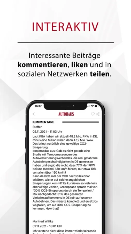 Modernes Design – egal ob am Tablet oder Smartphone – und einfaches Kommentieren und Teilen von interessanten Artikeln in Ihren sozialen Medien zeichnen die AUTOHAUS App aus.