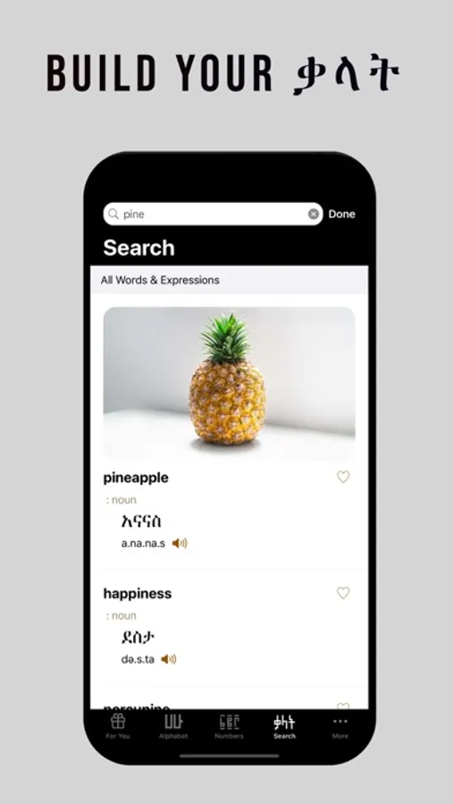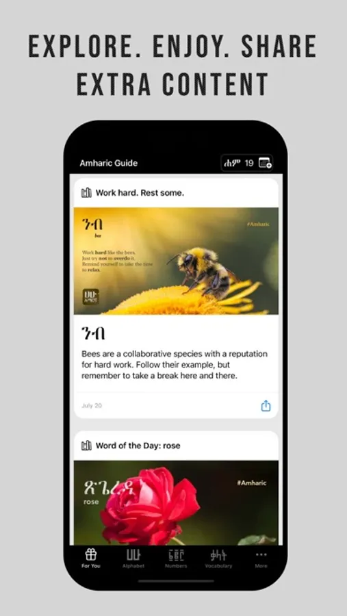 - Browse through and amass a vocabulary of words and phrases in the Amharic language