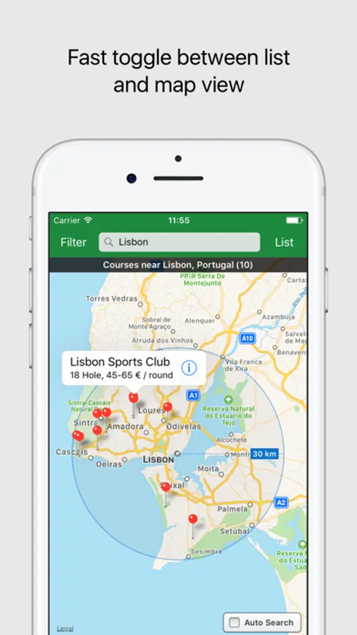 - Explore the world with the Auto Search function: as you navigate the map, the app automatically searches for courses in the visible area