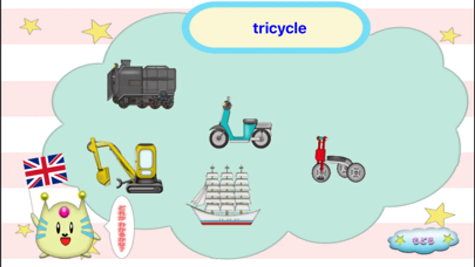 「のりもの」の読み方をフラッシュカードで覚えるアプリです。