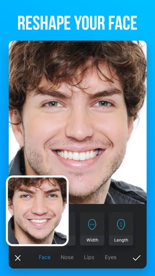 Don’t let your photographs be ruined by blemishes, scars, unwanted spots or wrinkles. Airbrush your skin with MenEditor to remove any imperfections from your face and make it look amazing. MenEditor offers a wide range of face editing options.