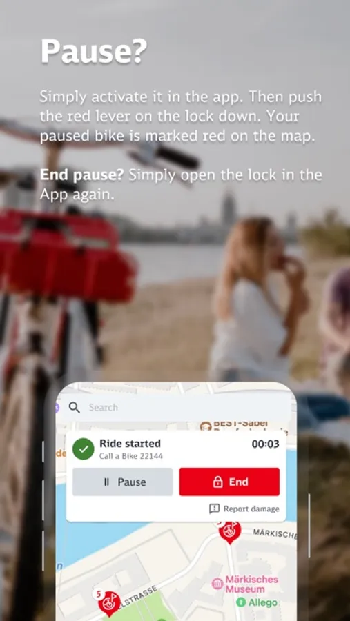 Now you can pause a ride at any time! Simply activate it in the app. Then push the red lever on the lock down. Your paused bike is marked red on the map.