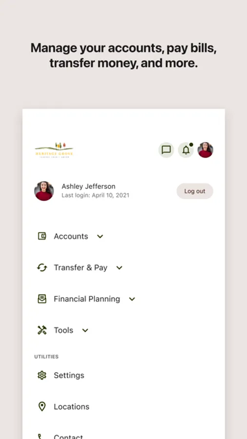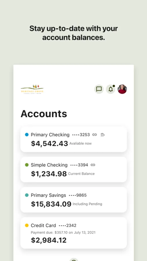 Heritage Grove Mobile allows you to check balances, view transaction history, transfer funds, and pay loans on the go!