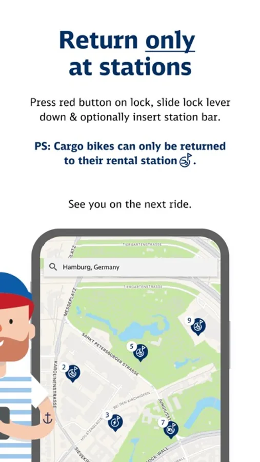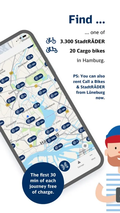 Everywhere in the city you will find a station where you can rent and return a bike around the clock. In the "Normal", "HVV" or "BahnCard"-tariff the first 30 minutes of each ride are free of charge. In addition to our StadtRÄDERN, you will also find cargo pedelecs at selected stations for big shopping trips and for your children!