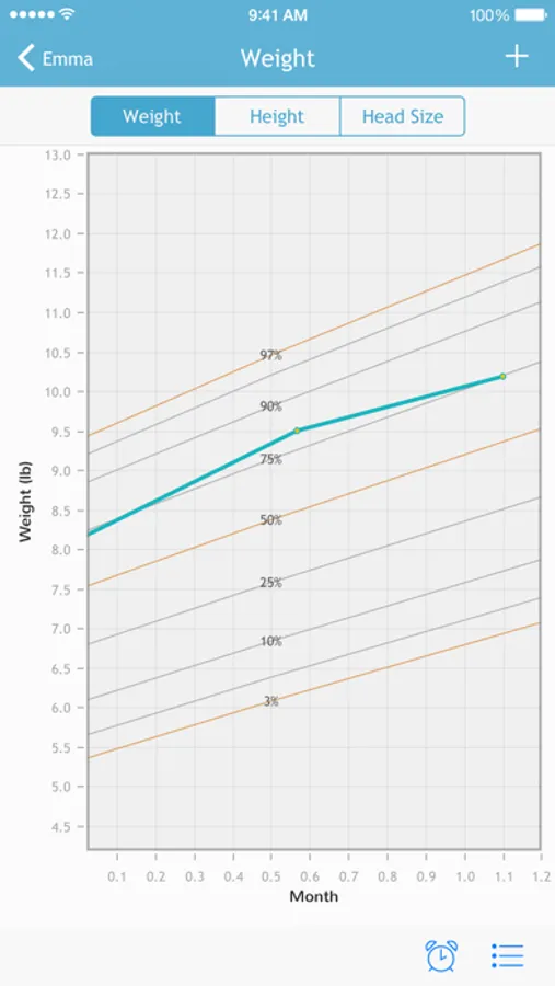• Record your baby’s height, weight, and head size, then see them all on our comprehensive growth chart.