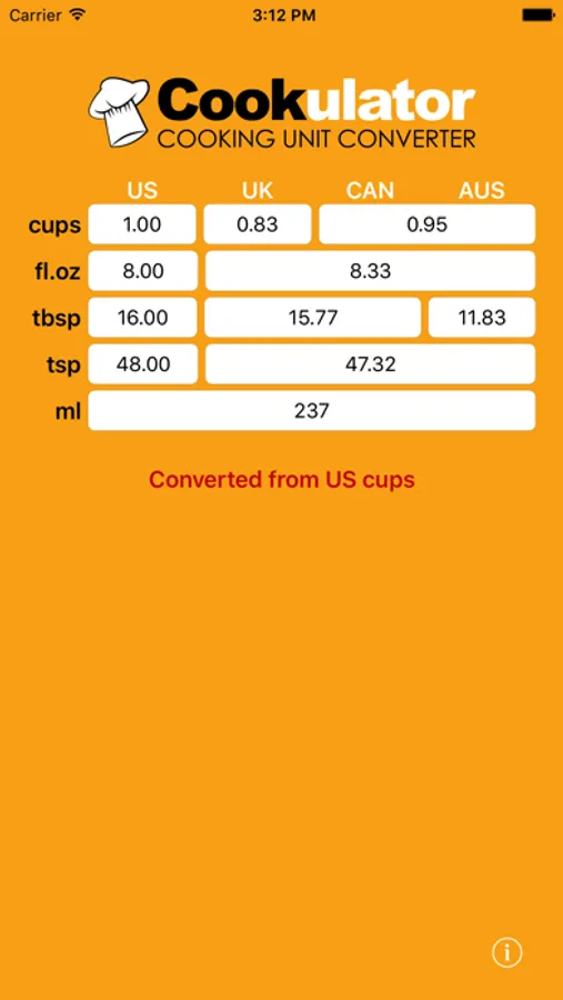 Cookulator Unit Converter is for super simple, one step cooking unit conversion. Just enter the amount next to one of the measurements listed, touch done, and the amount is converted to all the other measurements listed.