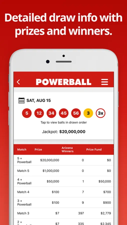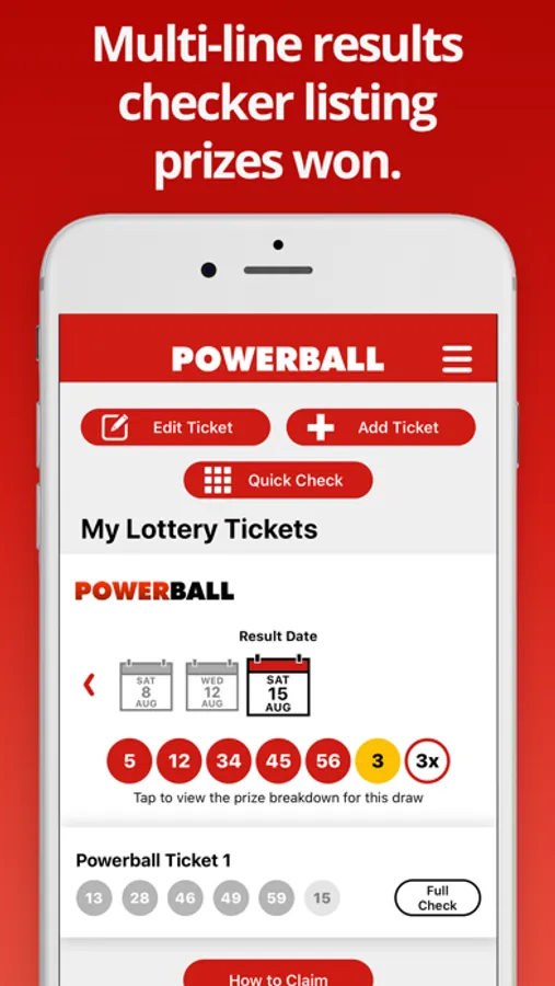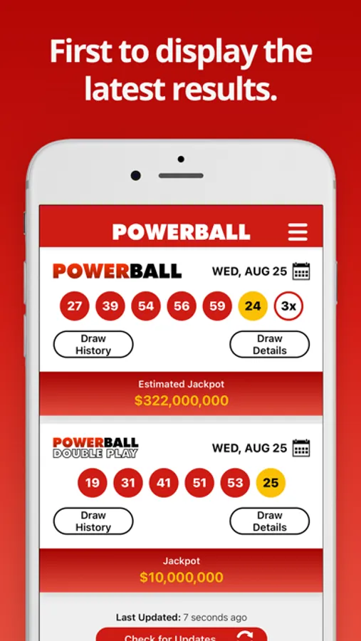 Get the latest Powerball results within moments of the draw taking place. This easy-to-use app shows the Powerball numbers (including Power Play and Double Play) and full prize breakdown including number of winners and prizes paid.