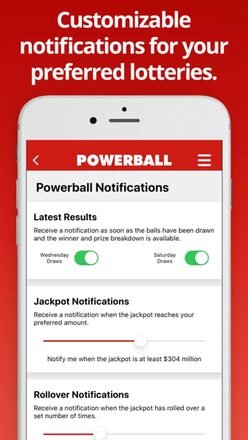 Get notified instantly when the latest lottery results and prize breakdowns become available. The App allows you to customise notifications for specific lottery games and you can also choose which days of the week you play. Want to know when the jackpot has rolled over or has reached a certain amount? Just head to the Notification section of the app to set up your alerts. There is also the option to set notifications at times that suit you - great for reminding you to purchase tickets before the draw.