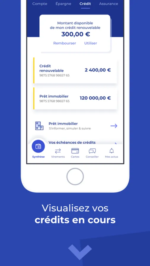 Pour consulter à tout moment vos comptes, vos prélèvements, vos crédits, vos assurances ou encore rester en contact avec votre Conseiller : notre application est indispensable !