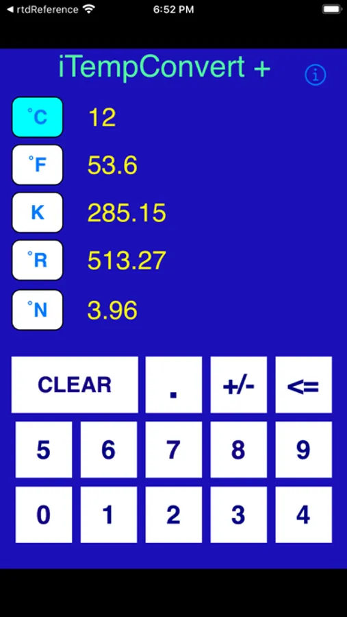 Like the original app, the Plus version is very simple to use. Merely tap the C, F, K, R or N key to select your entry mode and start typing the temperature value that you want to convert. Conversions to all the other temperature scales are performed instantly as you type, so there is no need for a Done or Enter key. Tap the +/- key at any time to toggle your value to a positive or negative value. There is also a backspace key for making corrections.