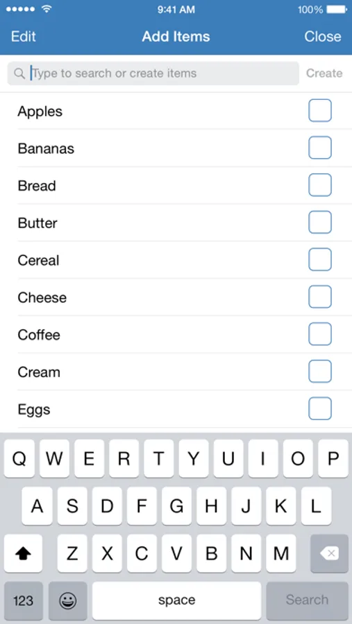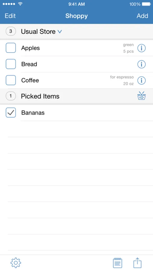 Shoppy makes it easy to add grocery items instead of coming preloaded with hundreds of them, for the simple reason that everyone has different needs and habits. Simply add your own items as you go along. Shoppy also doesn't use categories or multiple lists, it focuses on making your grocery shopping a breeze.
