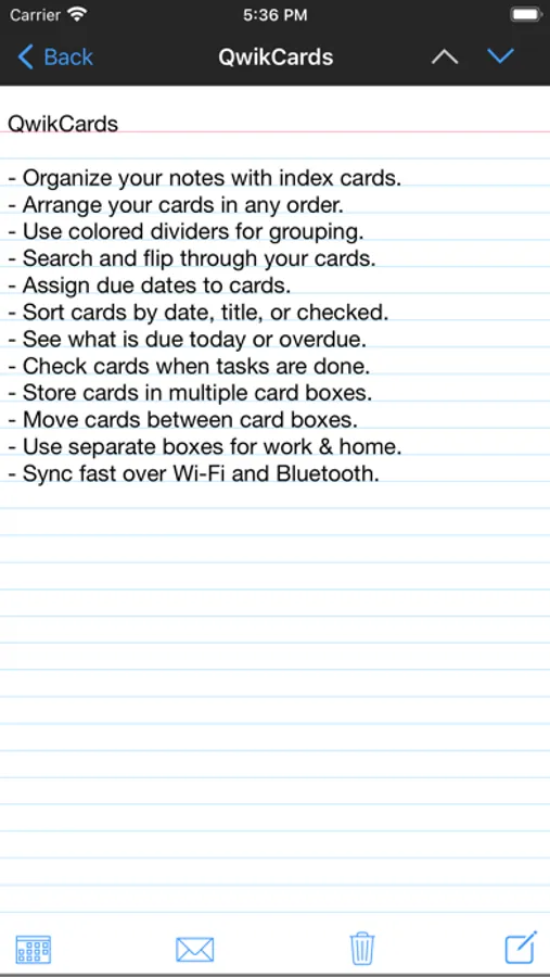 QwikCards organizes index cards. Use QwikCards for your notes and checklists on the iPhone, iPad, and Mac. With one touch, you can create a new card and start typing. Share your cards with other iPhones, iPads, iPods, and Macs over Wi-Fi and Bluetooth, even at the coffee shop!