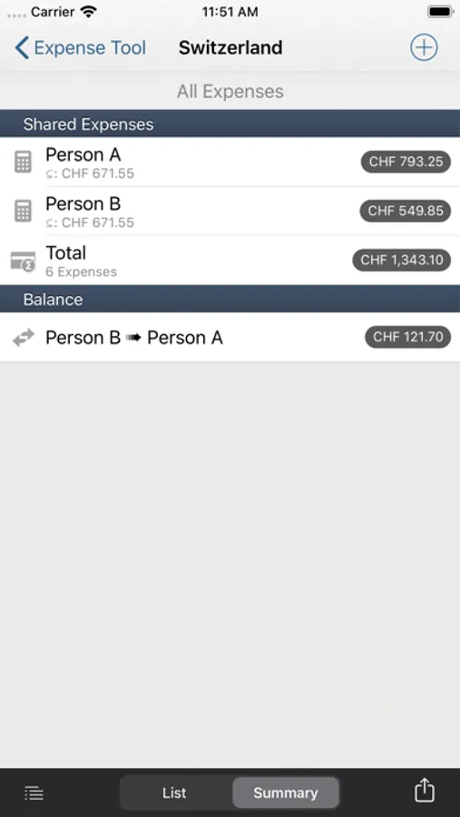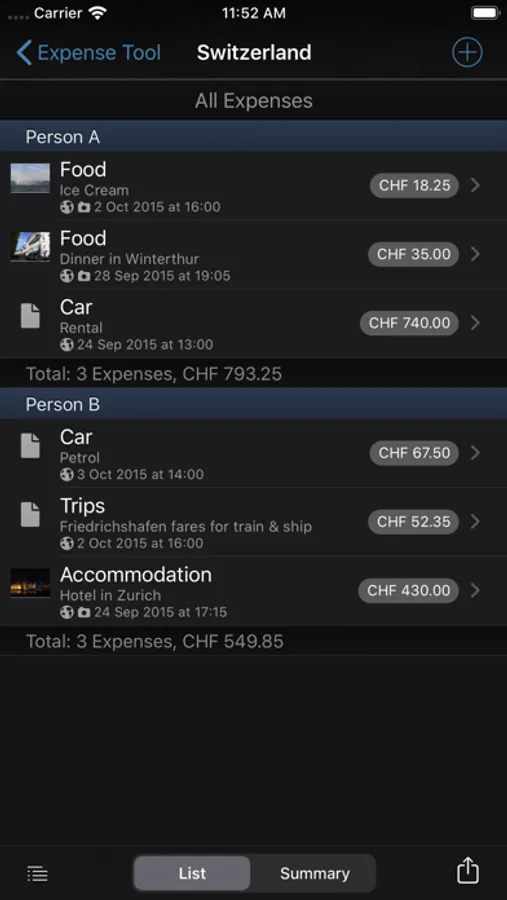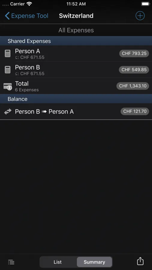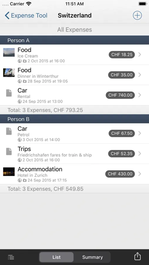Use Expense Tool LE, create an expense set and start entering your data. Your expenses can be listed, shown on a map, exported by email and printed. If more than one person is part of an expense set, you get a summary showing the total of all individual expenses and the balance of the shared expenses.