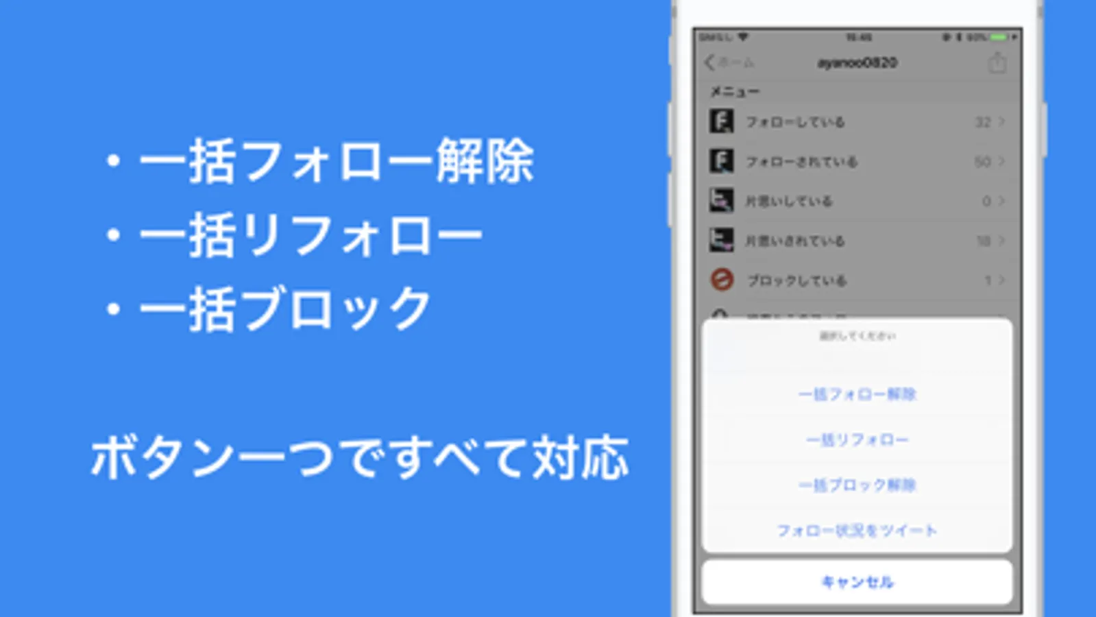 フォローを一人ひとり返すのがめんどくさい、フォローしてくれない人を全部アンフォローしたい。などTwitterのフォロー・フォロワーを整理したいときに便利です。