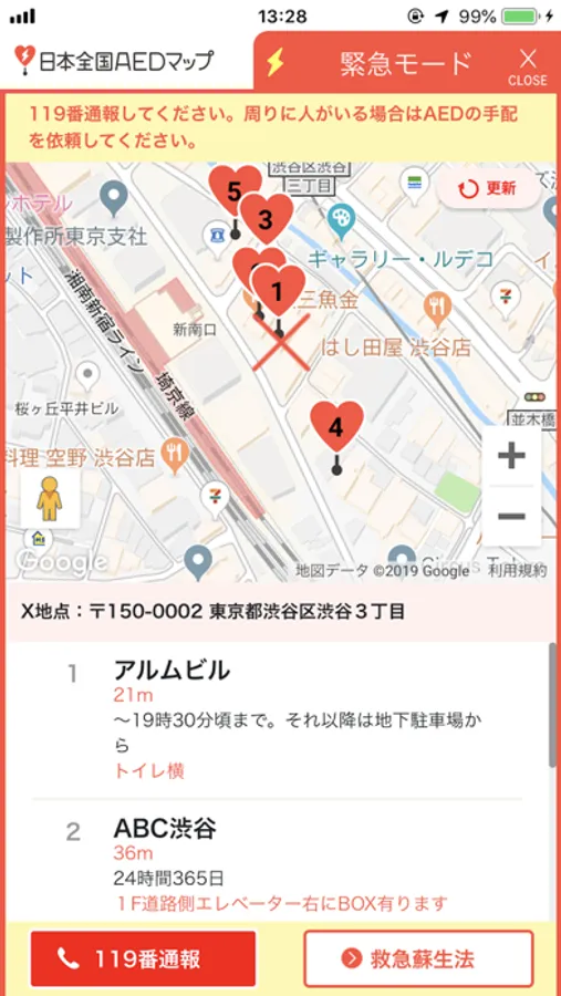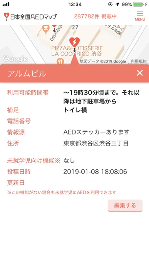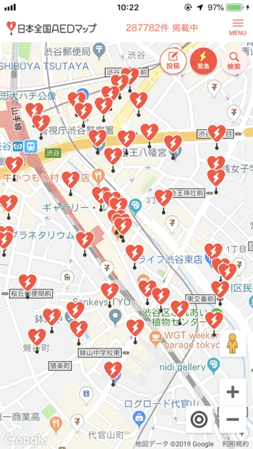 AEDの掲載データは一般投稿によって支えられています。未掲載のAEDや誤ったデータを発見された場合は、AEDマーカをタップいただき修正をお願いします。(PCでも編集ができます。)
