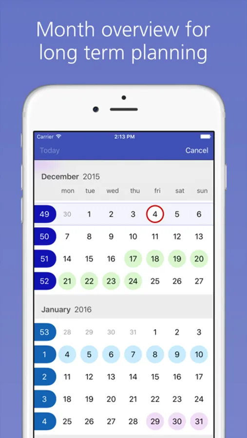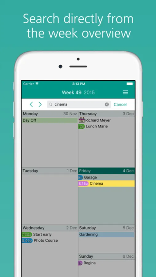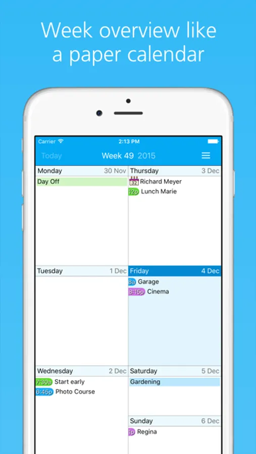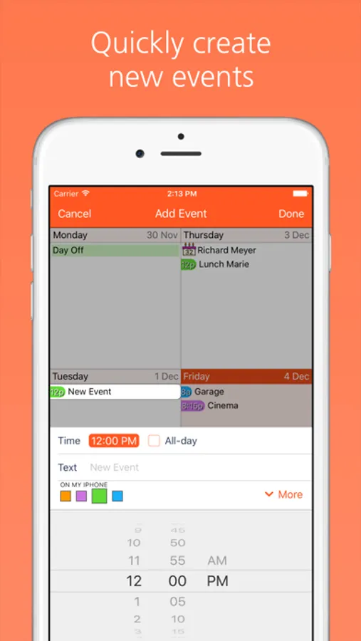 • Synchronization with iCloud, Outlook, Google Calendar, Hotmail and other CalDAV calendars using the native iPhone
