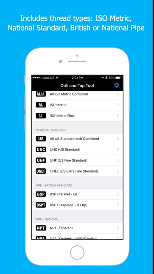 Whether you use Metric taps and drills, US Standard taps and inch drills, or any combination of size types, this app has the answers. No typing required; just tap your thread type and spin the dials to find the correct size of drill for your thread tapping operation.