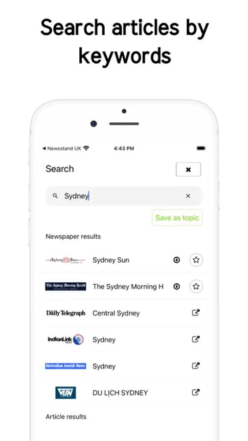 Read news by newspaper topic, save your favourite articles for later reading.