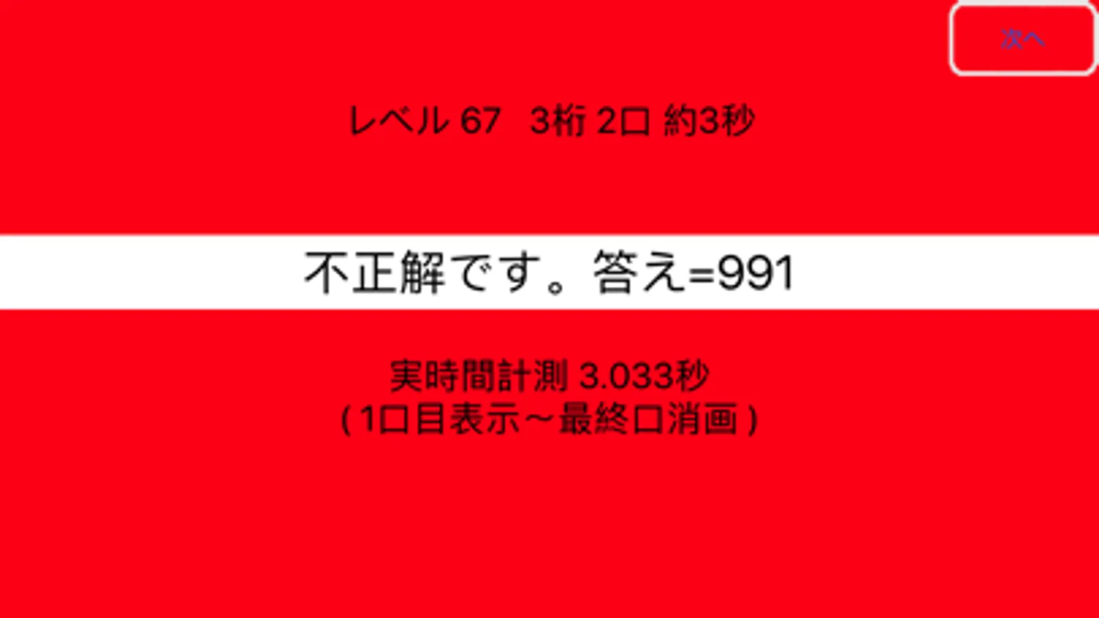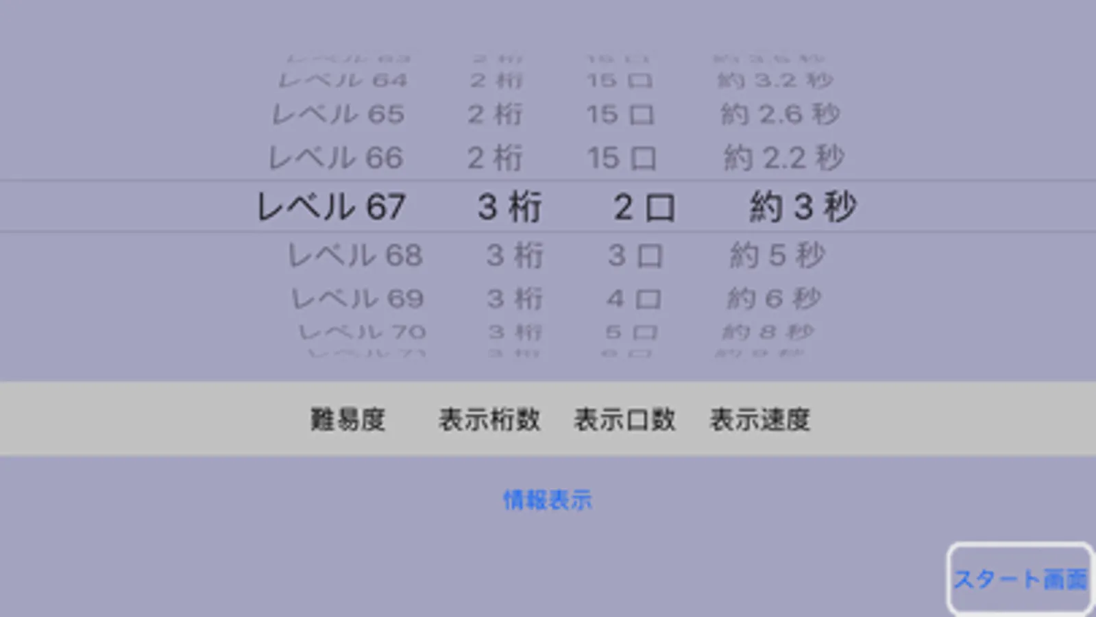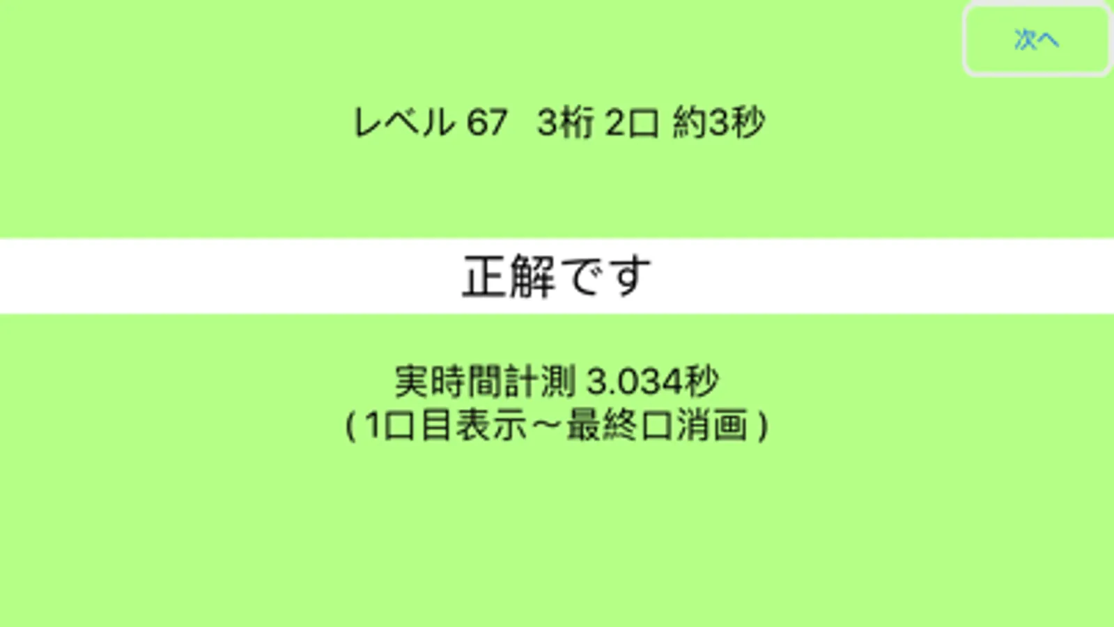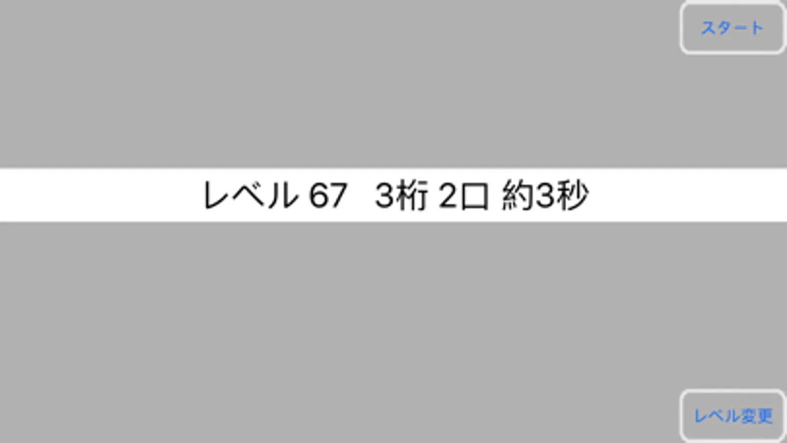 問題は、1桁2口3秒から3桁15口1.2秒までをレベル別に120段階で選択できるようにしました。