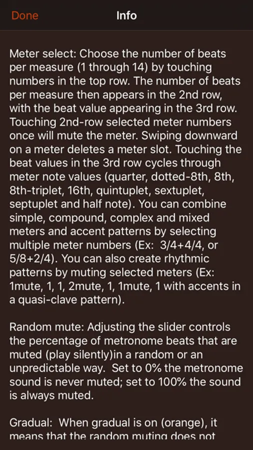 Strengthen your inner sense of rhythm! Time Guru is the only metronome with the ability to mute its sound at random, in sequenced patterns, or both, so that you can assess whether you tend to rush or drag or loose your place with odd meters. Time Guru can periodically leave you on your own so that you strengthen your own internal sense of time, rather than relying on the constant, rigid, external time keeping of a metronome. It's like training wheels that sometimes come up off the ground.