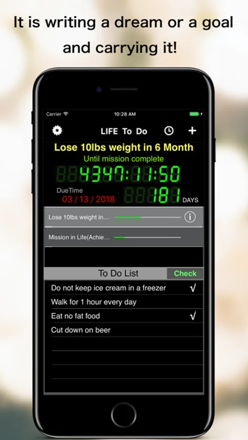 “Life To DO” is an application that sets numerous goals in your lives and counts down the remaining days and hours until the deadline for a goal.