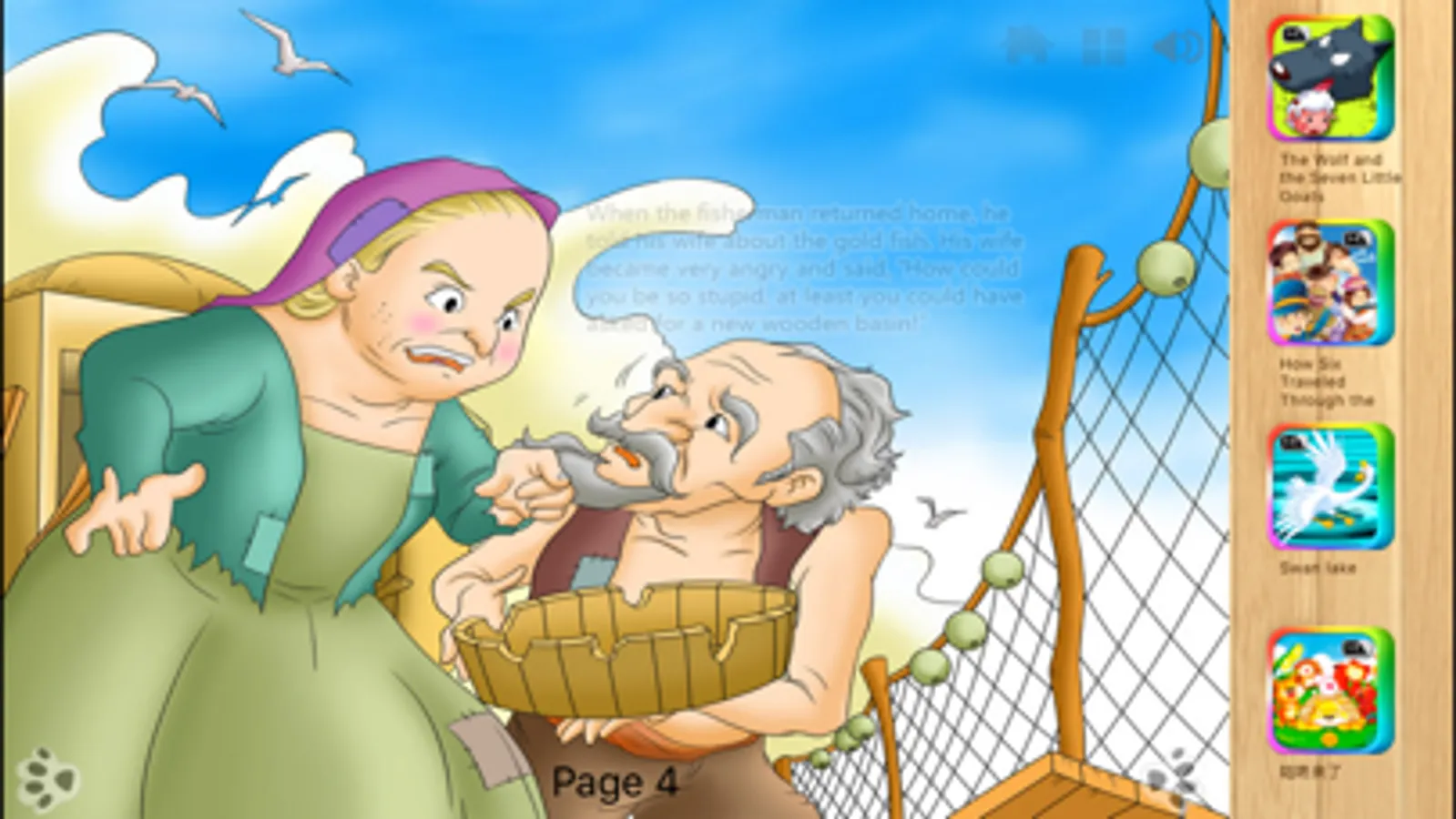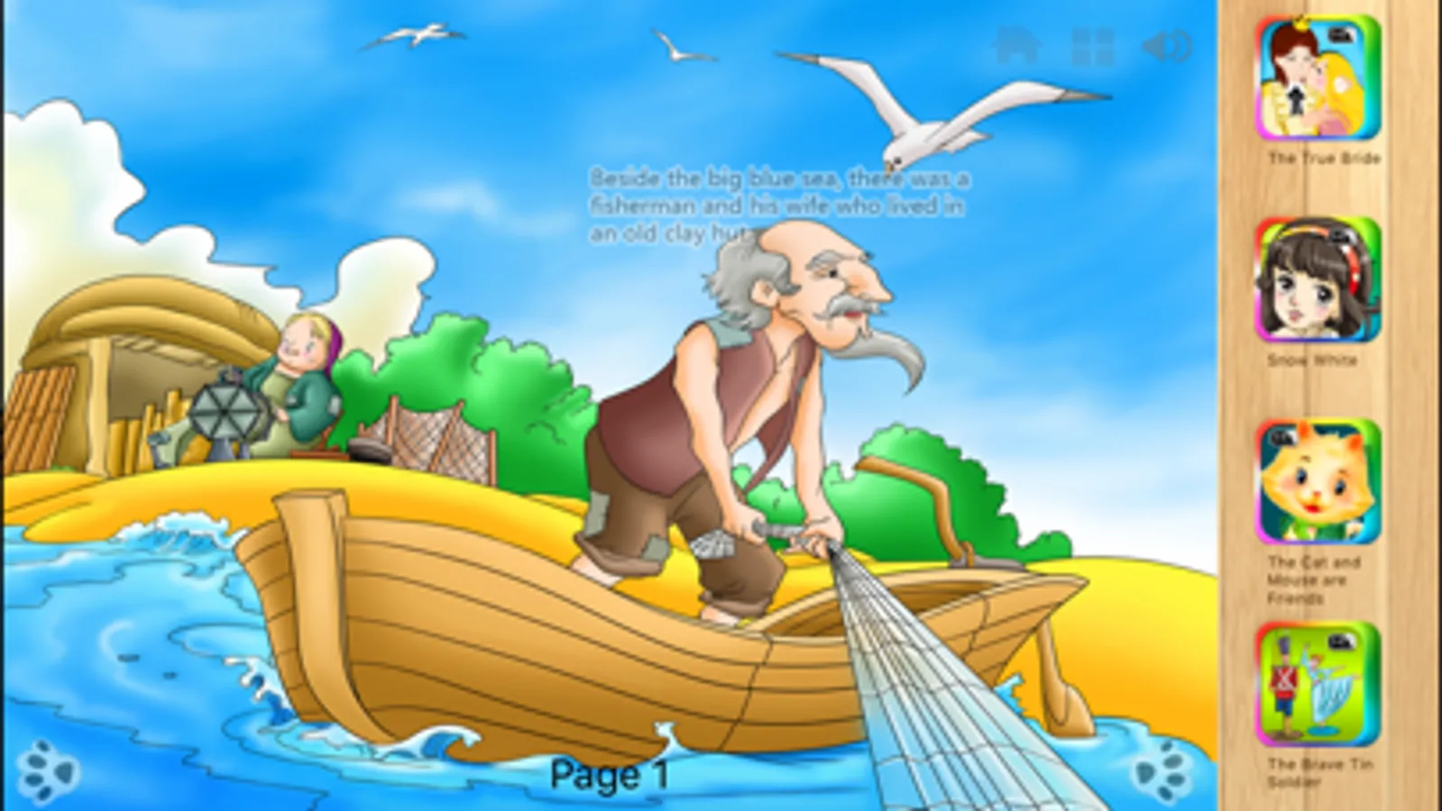 Classic story in new multimedia form: About the greedy old woman who always don't satisfy with her current life. Finally she turns into her original life. Your children can interact with characters inside. Sliding the scene inside the window, touching the goldfish ... incredible digitally-redesigned pages with every detail inside.