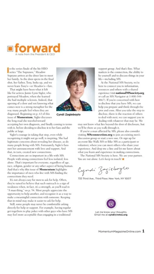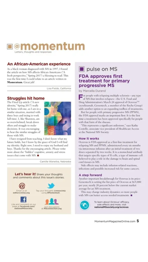 Momentum, the flagship magazine of the National MS Society, is the largest MS-related publication in the world. The quarterly magazine includes stories by and about people living with MS, expert opinion from MS specialists, and reports on current events, MS advocacy and advances in MS research.
