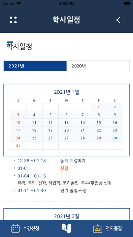 1. 학사일정 : 학교 학사일정을 확인할 수 있습니다.