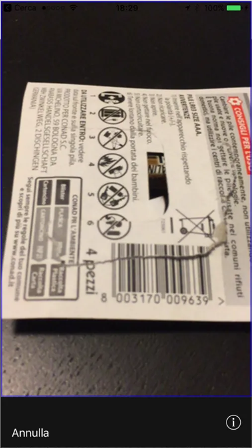 To start the scan, tap on the "START SCAN FROM" buttons (or shake te device), and the camera will start, ready to scan a code.