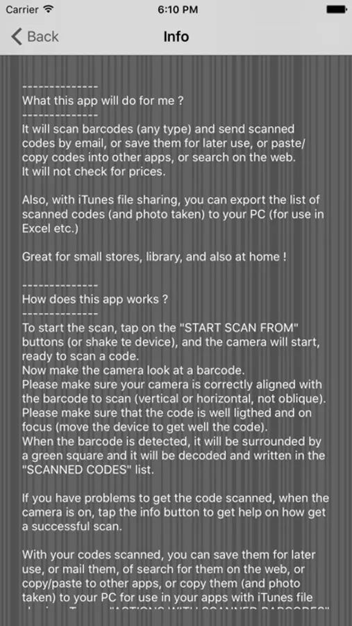 Also, with iTunes file sharing, you can export the list of scanned codes (and photo taken) to your PC (for use in Excel etc.)