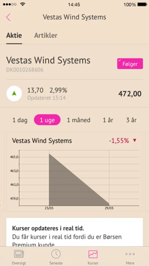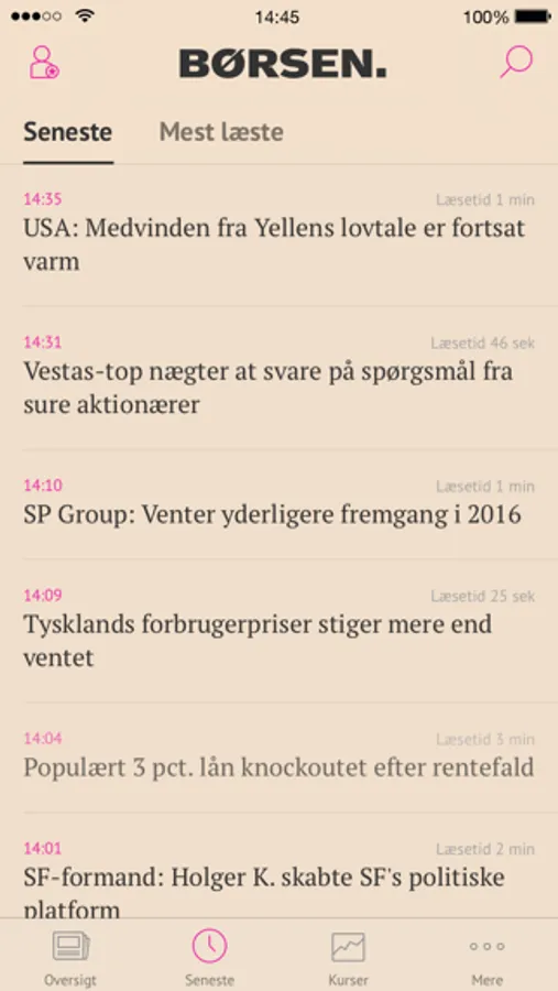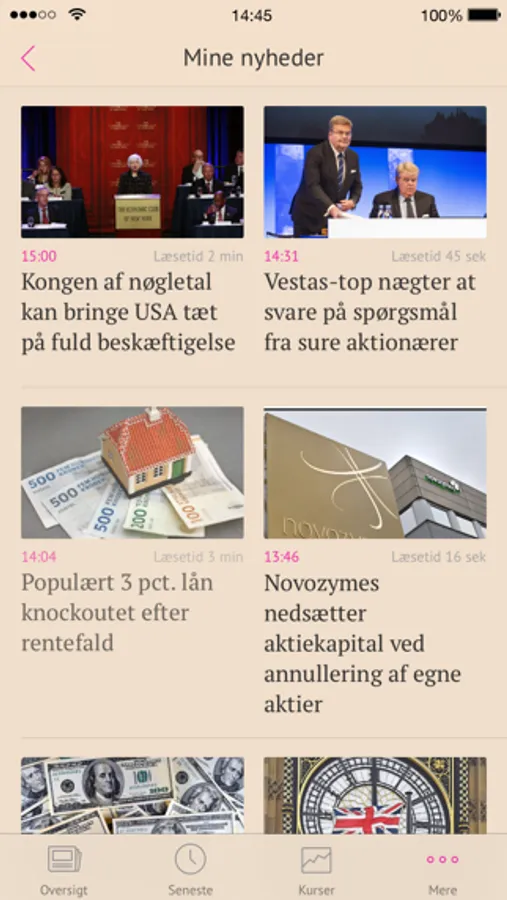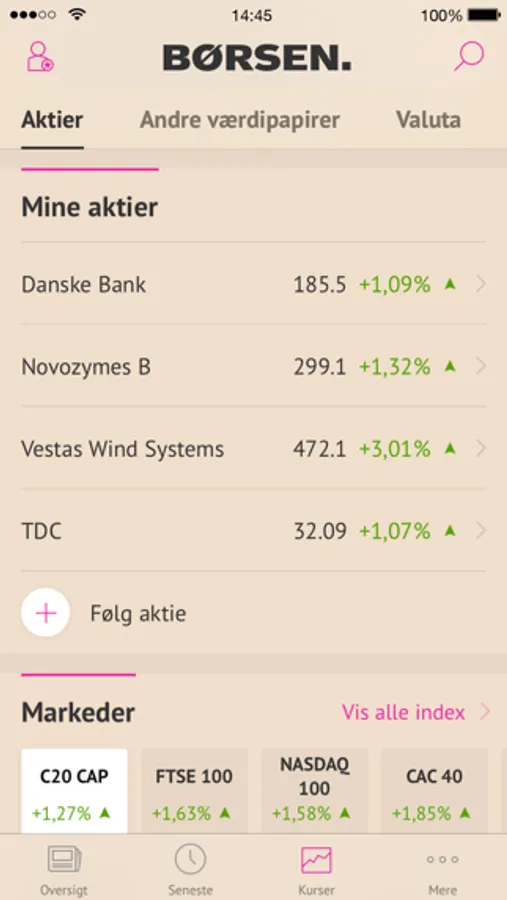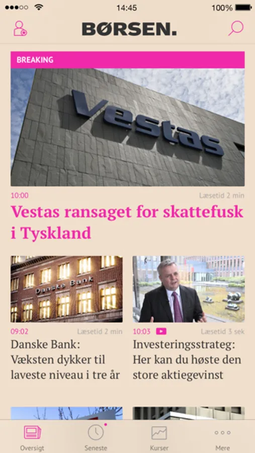 Børsen is the leading business medium of Denmark. With our app, you will be the first to know of the biggest news in economics, business, finance, investment, and politics. Select your relevant notifications, and we will keep you updated – also within the specific topics and industries that are important to you. Register for push notifications on real estate, companies, or stocks you want to follow or reviews of cars, food, and wine, so you don't miss out on anything. In the news overview, we prioritize the most important stories of the day. Here, you will find a list of the latest news giving you a quick overview. You can see the Danish stocks in real time when you are logged in – and with a 15-minute delay if you are not. If you are busy, you can save the article for later. You can download the app on multiple devices and set the push notifications differently.