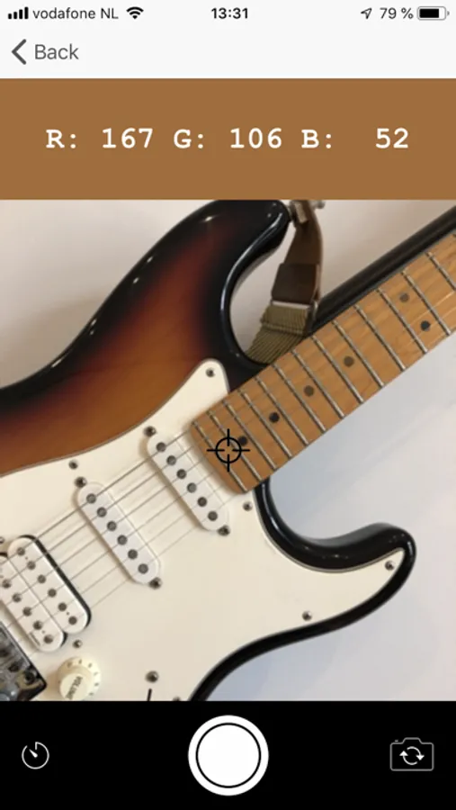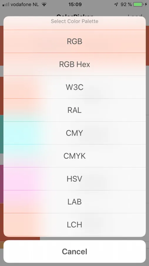 The free version of this app tells the RGB code only. You can upgrade to full version by InApp-purchase and access further color palettes including RAL and W3C color names, store your colours or send them by email.