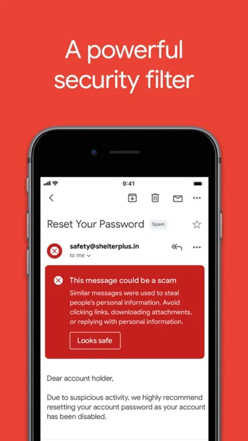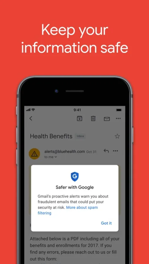 • Stay safe. Our machine learning models block more than 99.9% of spam, phishing, and malware from reaching our users