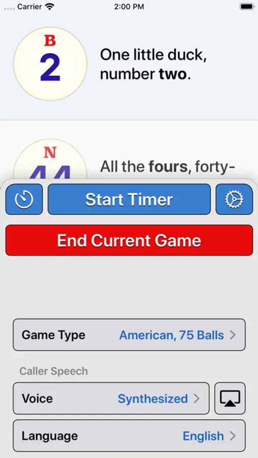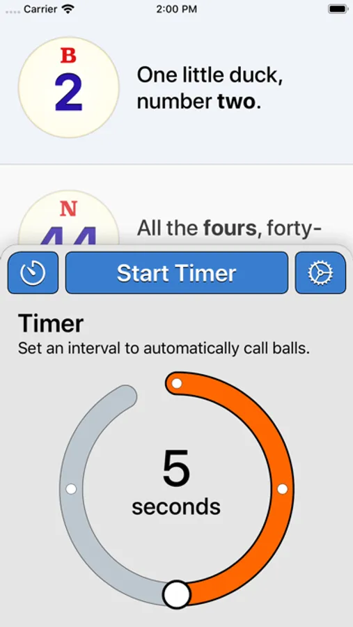 Use the Timer feature to call balls automatically, on a repeating interval. Set a time interval and Bingo Machine calls balls until the game is over.