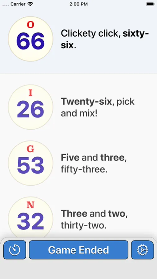 The app includes human and synthesized speech voices. Bingo Machine can read out each ball with recorded human male and female voices, or a high-quality synthetic voice for your language. Even if Bingo Machine is muted, it shows you bingo catchphrases on the screen so you know what to say as the announcer for each bingo number.
