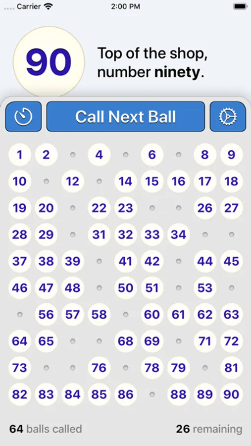 Bingo Machine adapts to the game type. For English-style games, call up to 90 balls. For American games, call up to 75 balls with each ball accompanied by its corresponding B-I-N-G-O symbol.