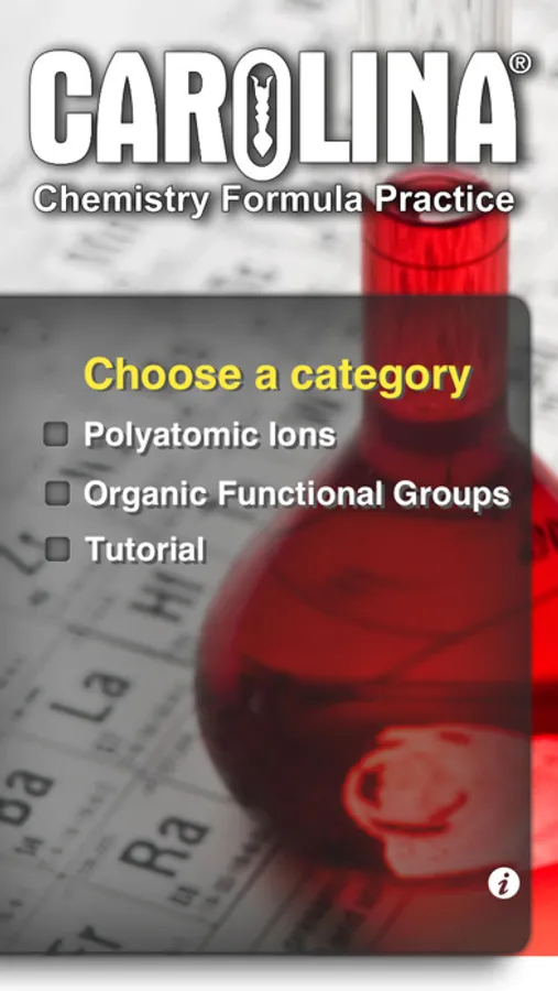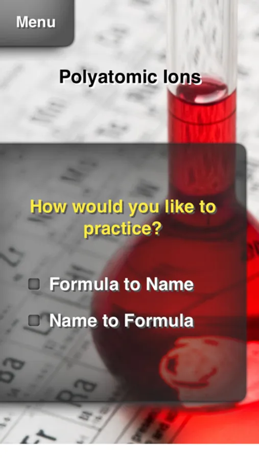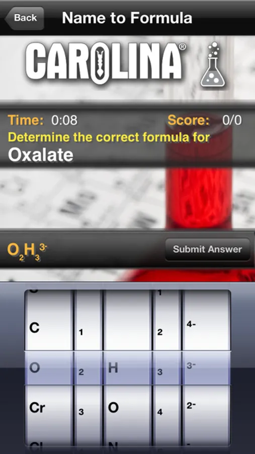 Chemistry Formulas Practice stimulates students’ mastery of the fundamental skill of naming compounds and writing formulas. The practice categories include ionic and molecular compounds, acids, bases, polyatomic ions, hydrocarbons, and organic functional groups. Students may choose their pace as they work from formula to name or name to formula.