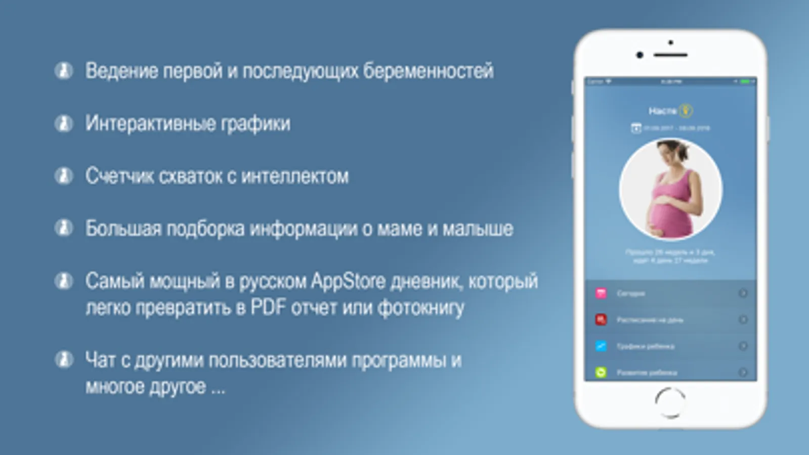 Настроив программу под себя, Вы всегда будете в курсе того, что должно происходить с Вами и вашим малышом. Программа наглядно представит Вам весь процесс течения беременности и после родов сформирует красочный PDF отчет с записями, ощущениями и фотографиями Вашей беременности.
