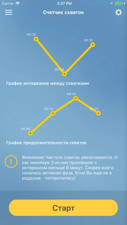 - В программу встроен счетчик схваток, который графически показывает продолжительность схваток и интервалы между ними. Пытается определить тенденцию и дает краткие рекомендации как стоит реагировать на схватки - пора ли собираться в роддом.