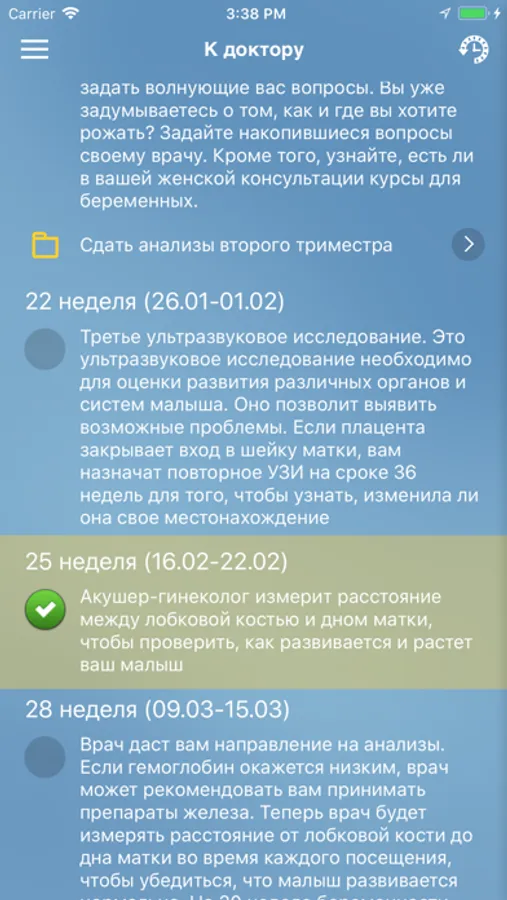 - В отдельном разделе расписан график посещения врача, подробно описывается какие анализы и наблюдения следует пройти будущей маме. Есть возможность помечать какие анализы (посещения врача) Вы уже сделали. И при желании отметки можно легко перенести в ваш дневник.